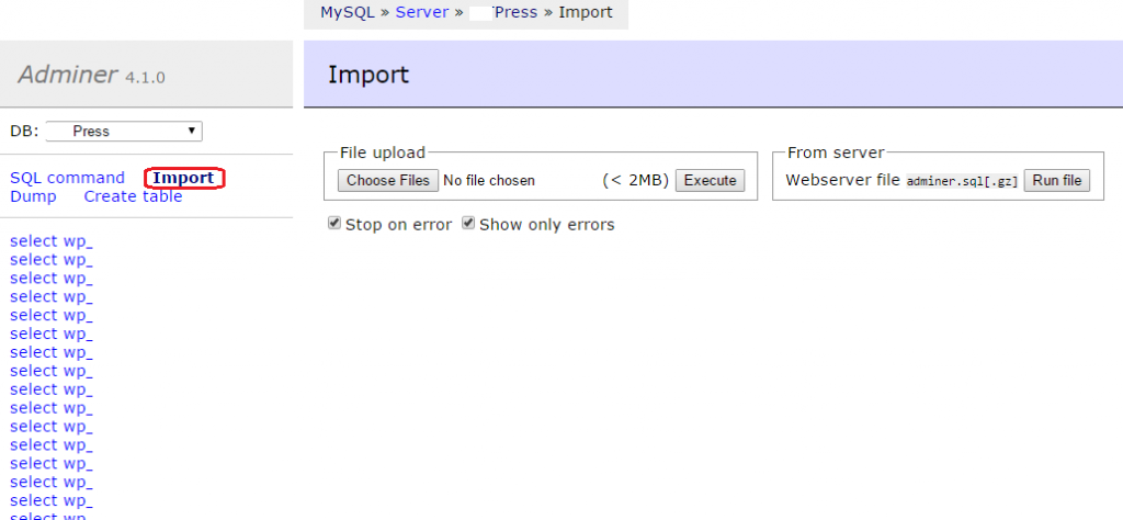 - You can either zip & upload your SQL file to the directory where you uploaded the Adminer.php or you can browse and upload directly from the Adminer page later.