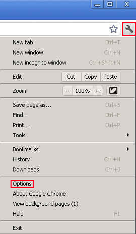 - Click the wrench icon (“Customize and control Google Chrome”) in the top-right corner of the window, then selectOptions.
