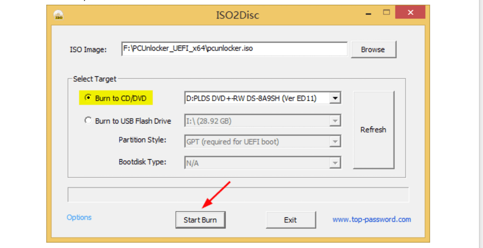 - Download and install the freeware ISO2Disc for creating bootable media. Start ISO2Disc and select the PCUnlocker ISO file you’ve downloaded, choose your target device (CD or USB drive) and click Start Burn.