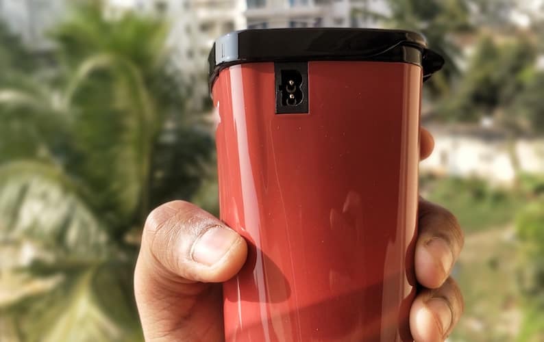 The company has tried their best to make the product as portable and convenient as possible. The design of the Intex Car Inverter is tall cylindrical (coffee mug shaped) with an exhaust fan at the bottom. The shape of the Car Inverter is very convenient to carry since it fits perfectly in the glass/coffee mug holder of the car. The ventilation fan at the bottom helps the inverter stay cool even during heavy use. The device is built using a plastic material however, the build quality seems pretty solid and durable. The red and black colour with a glossy finish enhances the design and look of the DC-200. The top of the device has multiple ports including an AC output port, two USB ports, a cigarette lighter port, and also a power button along with the power indicator LED.